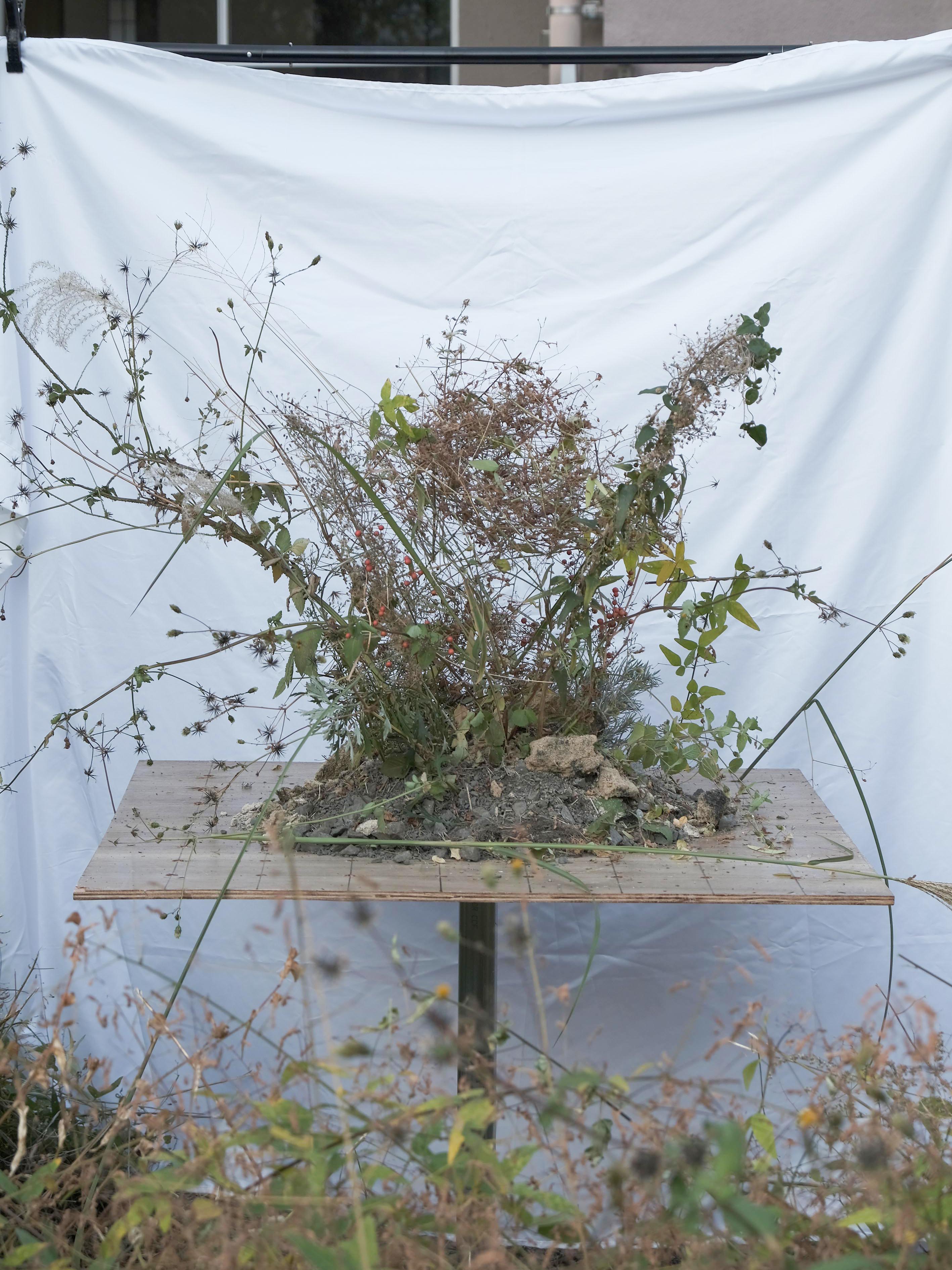 雑草の草刈りをしなくてもいいように、草木の育成を断つのではなく、在来の「雑草という状況」に秩序を与え、それを維持する研究を始めた。そして2022年7月から九ヶ月に亘り、名古屋市旧税関寮の庭に育つ雑草を剪定した。それら雑多な状況に調和する審美的な何かを探し、場と関連づけていくということを、その方法として実行した。