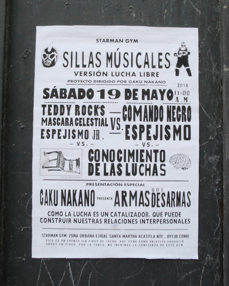 《椅子取りゲーム》は、椅子が“Foreign Object”(試合中に使用される凶器の総称)の記号的な存在であることや、その遊びが世界中で親しまれていることから着想を得た。私はこのレスラー達による椅子取りゲームを通して、椅子が信頼し合う(エンターテイメントであるという設定を守る)関係の上で武器となり、過激なやりとりの実現が逆説的に信頼関係を強くすることに触れた。