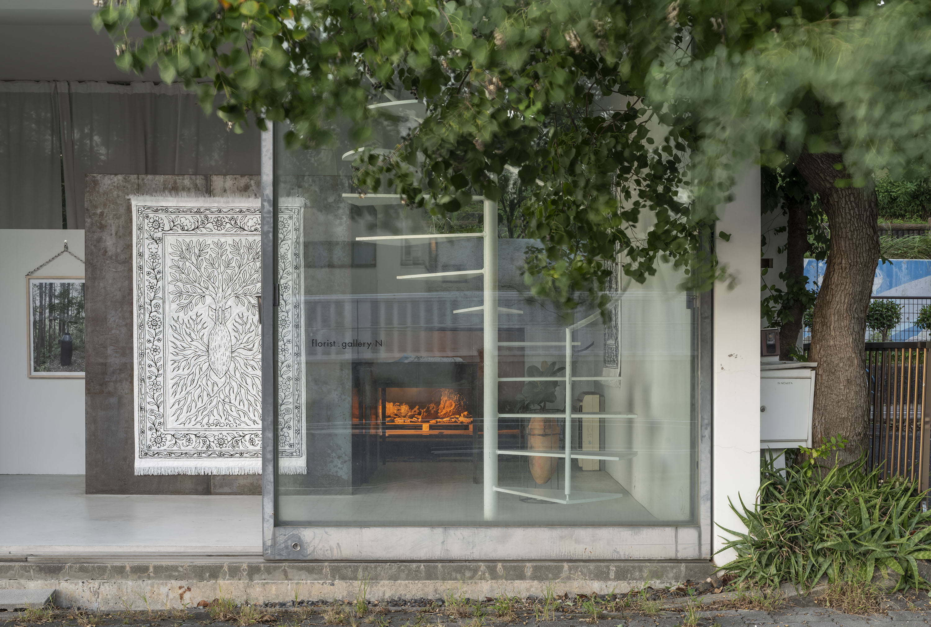 [1] «Roots of the Unexploded #1», w110 x h180 x d1 cm, PE sheet, tufting cloth,yarn, photo by ToLoLo studio, [2] «Roots of the Unexploded #2», w100 x h168 x d1 cm, PE sheet, tufting cloth, yarn, [3] «A flowerpot (unexploded bomb)», w30 x h90 x d27m, pottery, resin, iron, plant (Ficas) , soil, saucer, [4] Detail «Roots of the Unexploded #1», [5] «Roots of the Unexploded #3-4», w42 x h60 cm, sandbag, sewing thread, [6] A flowerpot (boxing glove)», sandbag, soil, plant(Schefflera), mortar, [7]-[8] «Firing up a flowerpot» installation, pottery, pallet, video 5'48'', 2023