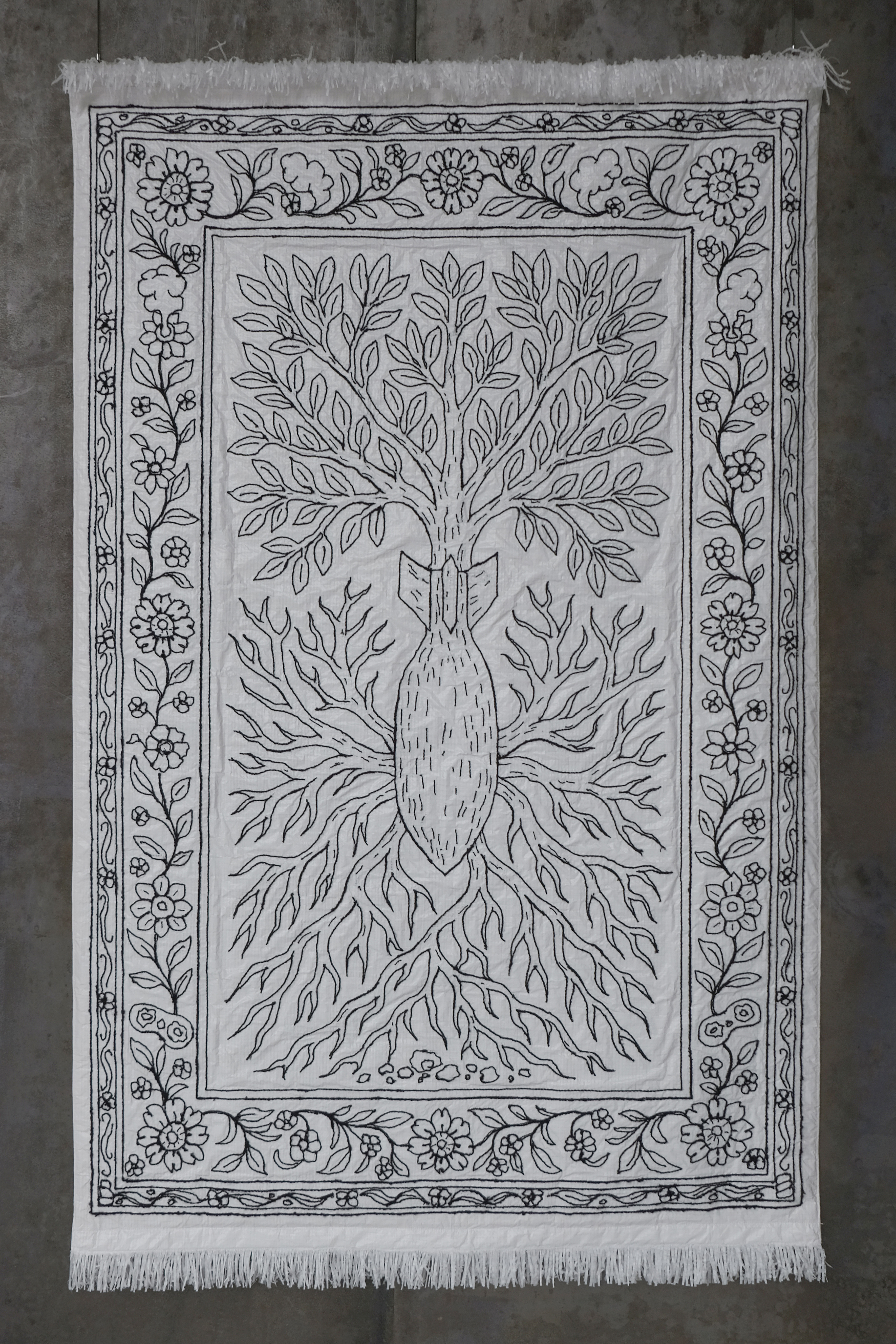 «Roots of the Unexploded #1», w110 x h180 x 1 cm, Embroidery on PE Sheet, 2025