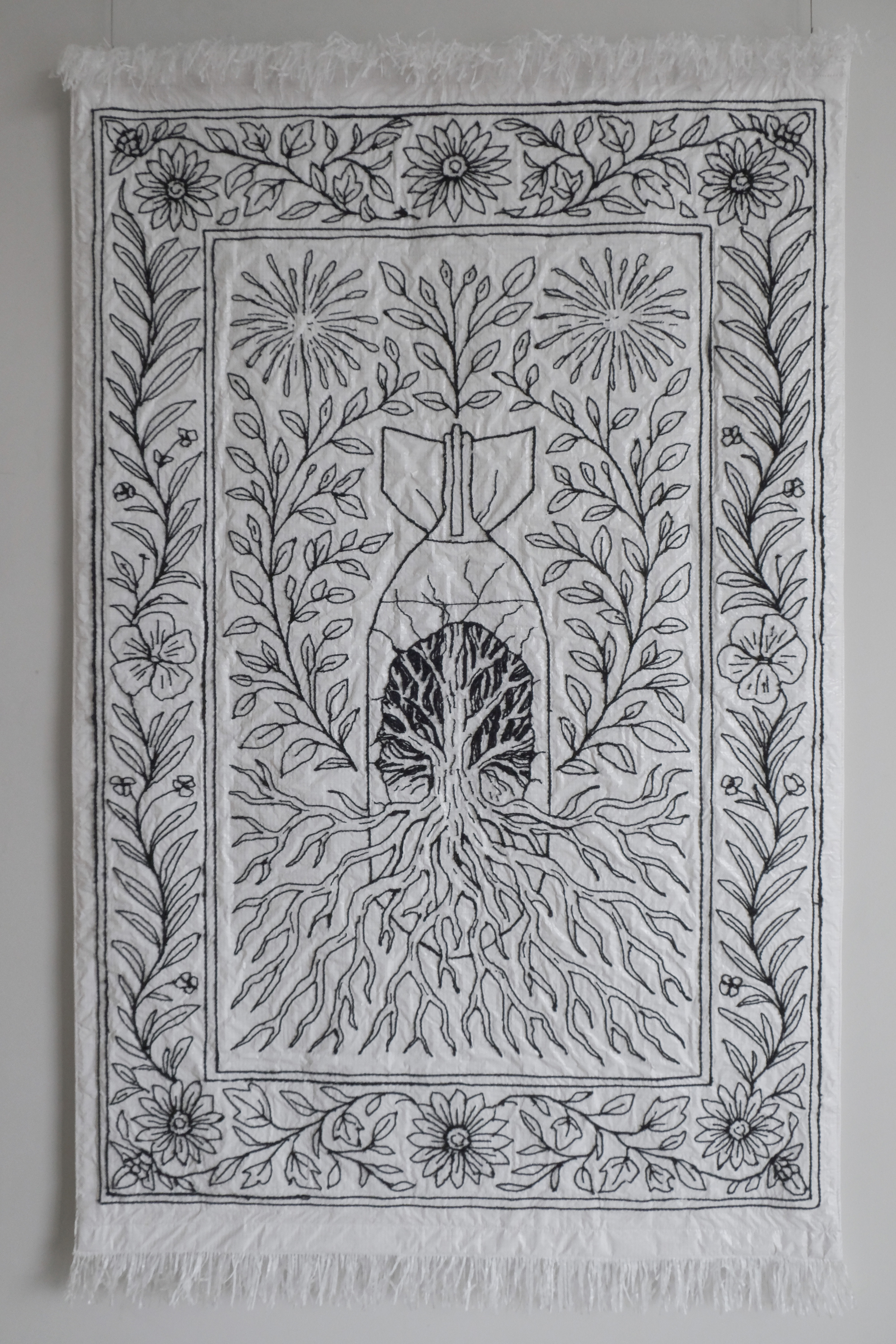 «Roots of the Unexploded #2», w100 x h168 x d1 cm, Embroidery on PE Sheet, 2025